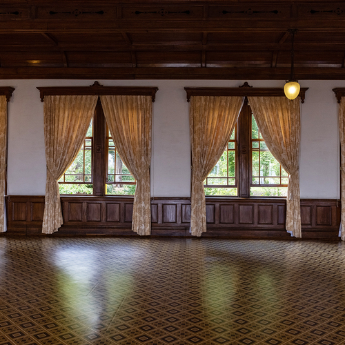 約429平方メートルの大広間はクラシカルなカーテンと窓に縁取られ、外の緑がレトロな柄の床に写り込む様子が印象的。