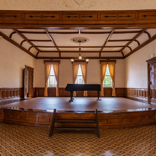 前方のステージは、木製の床に注ぎ込む光の反射が素敵。