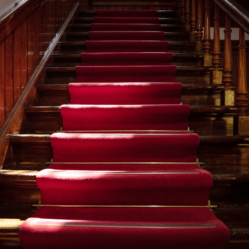 階段に敷かれたカーペットに、注ぎ込む朝日。光と影のコントラストが見事。
