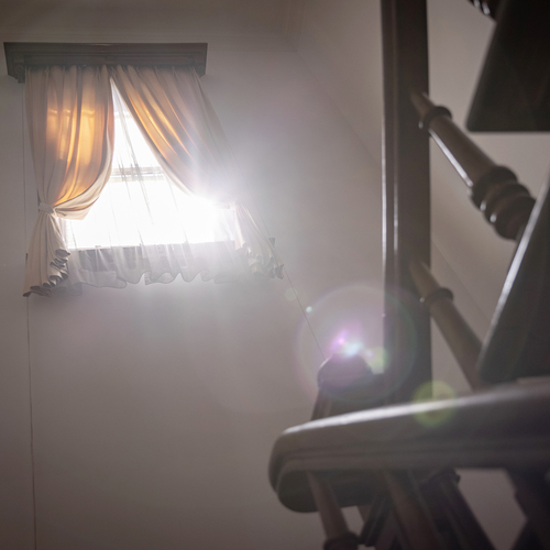 階段を見上げて、高い窓から注ぎ込む朝日をキャッチ。