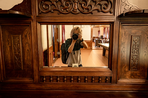 バルコニーから大広間を振り返って。シックな木の色を生かした扉と黄色の窓枠、ホールのシャドー......明暗の対比が面白い。