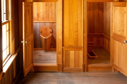 階段近くには「御後架(お手洗い)」「御湯殿(浴室)」が設けられました。公会堂完成後の1911(明治44)年に、皇太子時代の大正天皇の行啓の際に増築されたもので、エゾマツやヒノキが用いられたとのこと。当時の雰囲気が今もそのまま残されています。
