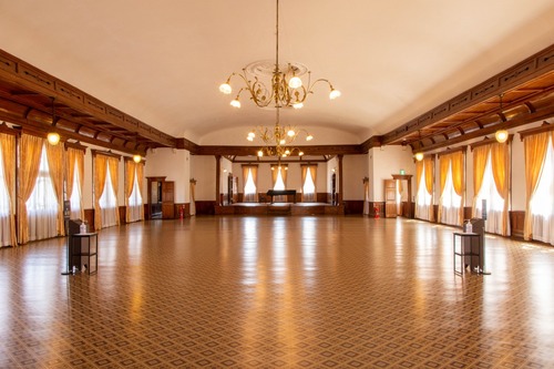 旧函館区公会堂内の最大の見どころといえる、2階の大広間。つり天井で柱がない広大なスペースであるところが特徴です。演奏会などの娯楽的な催しが開催されてきたほか、大正時代には函館市市制祝賀会の会場として、1927(昭和2)年には小説家・芥川龍之介と里見弴の講演会も行われました。