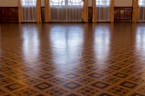 床には、亜麻仁油にコルクや顔料を混ぜて作られる床材「リノリウム」が使われています(今回の改修で復元)。茶色の濃淡による斜め格子柄を配した寄木風のデザインで、当時の床の残片や古写真から推定して、デジタル印刷で再現されました。