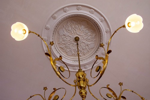 広さにばかり圧倒されそうですが、周囲の細かいデザインにも注目。照明(レプリカ)の取りつけられている漆喰天井の「中心飾」は明治時代からのもので、ベルフラワーやアカンサス、六弁花、五弁花などがデザインされています。