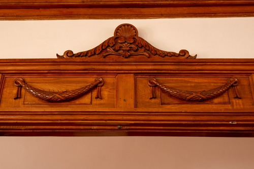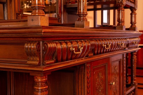 一画にある大きな家具は、函館洋家具「鏡付洋風飾り棚」と呼ばれるもので、もともとここの大食堂に設置されていました。今回、市内の家具職人が引き出しの建てつけ調整や失われた部品の補修などを行ない、美しい姿で蘇らせています。