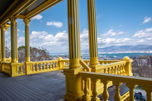 大広間からは、ぜひバルコニーに出てみましょう。旧函館区公会堂は、函館港を一望できる基坂の上に建てられたので、開放感あふれる景色が堪能できます。