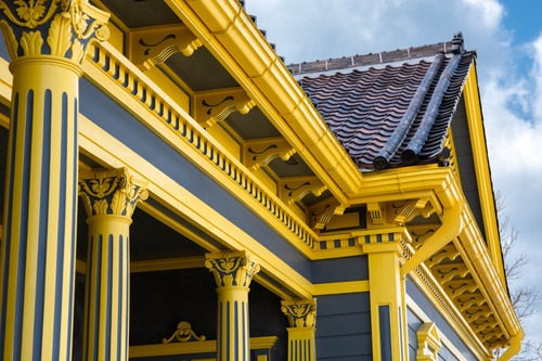 バルコニーから振り返って斜め上を見ると、屋根に葺かれた瓦が間近に眺められます。洋風建築の旧函館区公会堂ですが、和の要素も取り入れられているのが特徴。瓦屋根に軒の蛇腹や持ち送りなどの黄色のアクセントが新鮮な印象です。