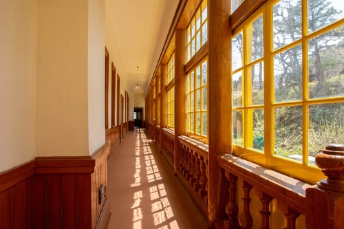 大食堂や球戯室の後ろ側の「縁側」は、絶好のフォトスポット。太陽の光が入ると床にガラス窓の影が映りますが、じっくり見るとこのガラスの特徴がわかります。影が波打っているものは古くから使われている「手延べガラス」。交換された現代のガラスは影ができません。
