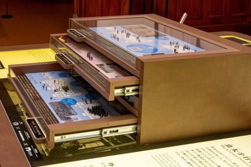 「旧公会堂のうつりかわり」のパネルで目をひくのは、4段の引き出しからなる小さな模型です。下から順に、「竣工から戦中期」「戦後の混乱期」「公会堂再開と昭和修理」「平成~令和修理」と、時代ごとに公会堂の歴史が紹介されています。