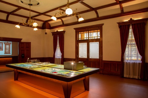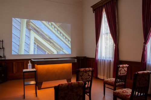 2階に向かう階段付近の部屋は、2018年秋から実施された保存修理工事の映像記録(約12分)が上映されるシアターになっています。ここでの主役のもうひとつは、観覧時に座ることができる椅子。座面の張り替えはされていますが明治時代からある貴重なもので、実際に座って、感触を確かめながら、映像を見られるようになっています。