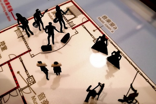 それぞれの引き出しには、精巧に作られた小さな小さな人物の模型が配置されています。最上段には、ハイカラ衣装を着て大広間にたたずむ女性の姿や、ステージでコンサートを行うロックバンドらしき姿が......。遊び心あふれる展示は必見です。
