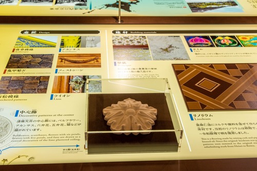 旧函館区公会堂で使われている建築材料やデザインに関するパネルでは、漆喰天井の中心飾りの「五弁花」、大広間で使われている床材「リノリウム」、壁紙やタイルといった建材など、見どころの詳細がわかります。