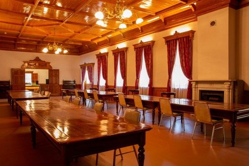 1階の中央部から右手にある大きな部屋は「大食堂」だったところ。当時のままのテーブルが並び、落ち着いた雰囲気が感じられます。現在は休憩スペースになっていて、明治時代の雰囲気を楽しみながら、椅子に座って休むことができます。