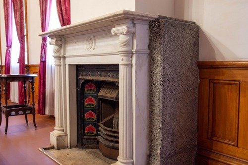 壁際にある暖炉も、明治時代からのもの。当時としては貴重なイギリス製のヴィクトリアンタイルが使われています。