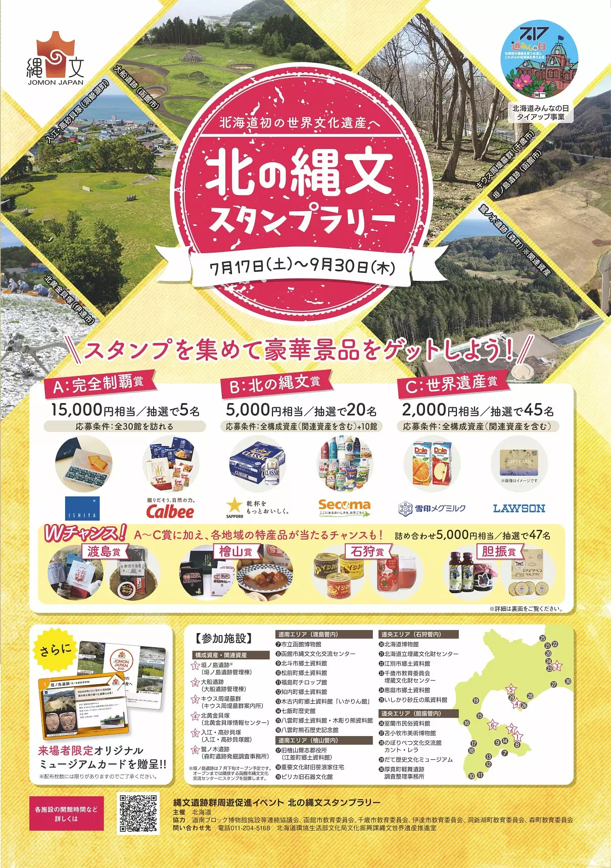 函館市の垣ノ島遺跡・大船遺跡をはじめとする北海道内の構成資産・関連資産(各遺跡の展示施設を含む)と、各地の博物館・郷土資料館など計30カ所が対象です。集めたスタンプの数に応じて、各地域の特産品などが当たる抽選に応募できます。期間中は、各施設で来場者にオリジナルミュージアムカードを配布します。