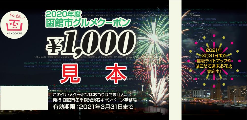 函館市内の登録ホテル・旅館などに宿泊されるかたを対象に、指定の飲食店で使える「函館市グルメクーポン」2000円分を、1人1セットプレゼントします。