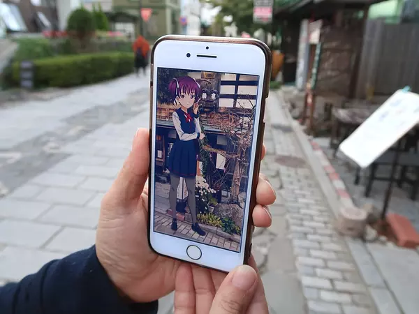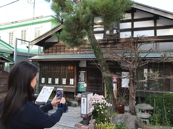 「Saint Snow」の生家、茶房 菊泉の前で。アプリを起動してマイARを選び、好きな場所を背景にすることも可能。※写真はイメージです