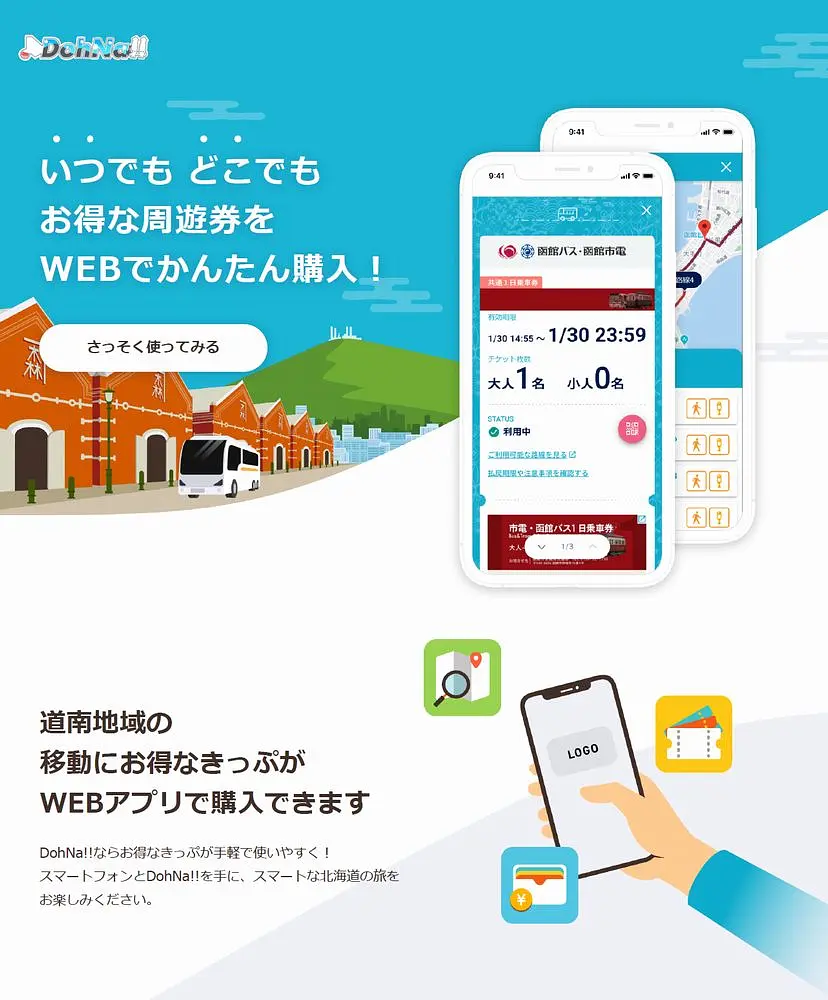函館の市電やバス、近郊の鉄道やフェリー会社などが連携し、Googleマップで経路を検索したり、乗り放題チケットをスマートフォンで購入・使用できるなどの、便利なサービス「DohNa!!(ドーナ)」。