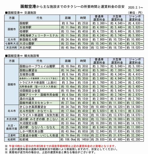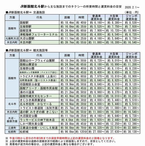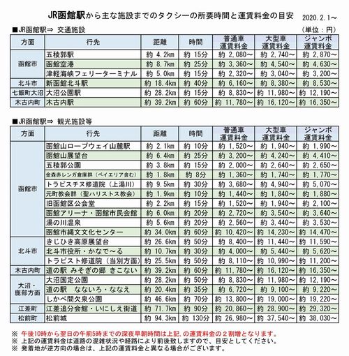 道路の混雑状況や経路によって実際の料金は変わりますが、参考にしていただければと思います(2020年2月1日改定。函館地区ハイヤー協会のホームページより許可を得て転載)。
