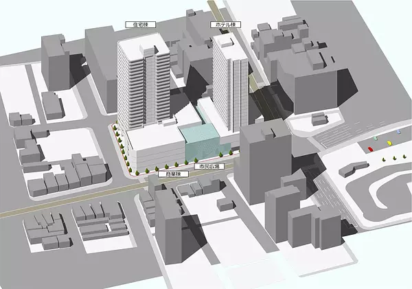 ホテル棟、住宅棟、商業棟、市民広場が配された鳥観パース。右下がJR函館駅前広場