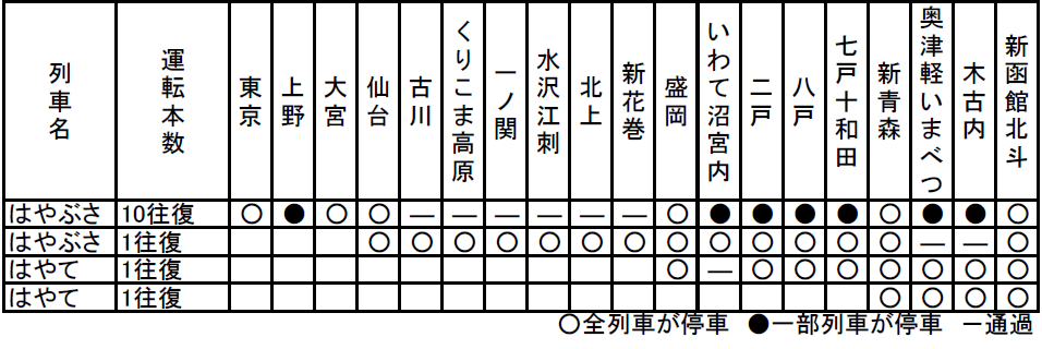 全列車が停車するのは、大宮、仙台、盛岡、新青森です。