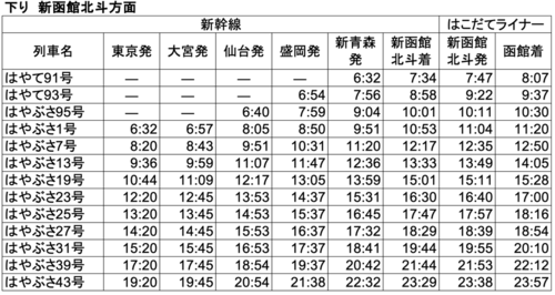 北海道新幹線は、東京と新函館北斗を最速3時間57分で運行します。終点の新函館北斗駅と、観光の拠点となる函館駅の間は、JRのアクセス列車「はこだてライナー」が15~22分で走行。その結果、東京~函館の所要時間は、トータルで4時間26分~5時間16分となっています(臨時列車を除く)。⇒時刻表検索はこちら