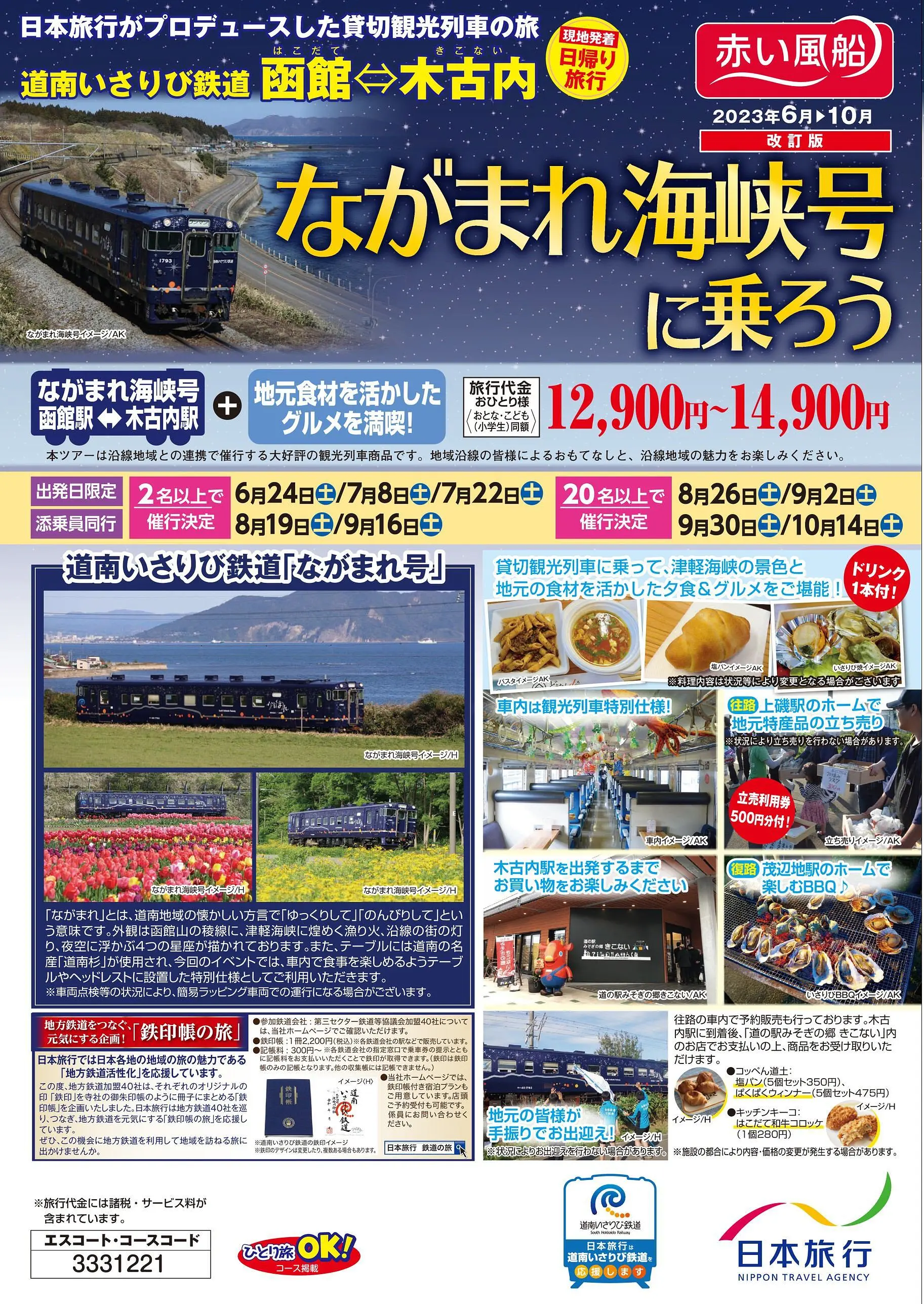 函館と近郊の木古内を結ぶ道南いさりび鉄道の人気観光列車「ながまれ海峡号」ツアーが、2023年度も企画されています。現在予約受付中。
