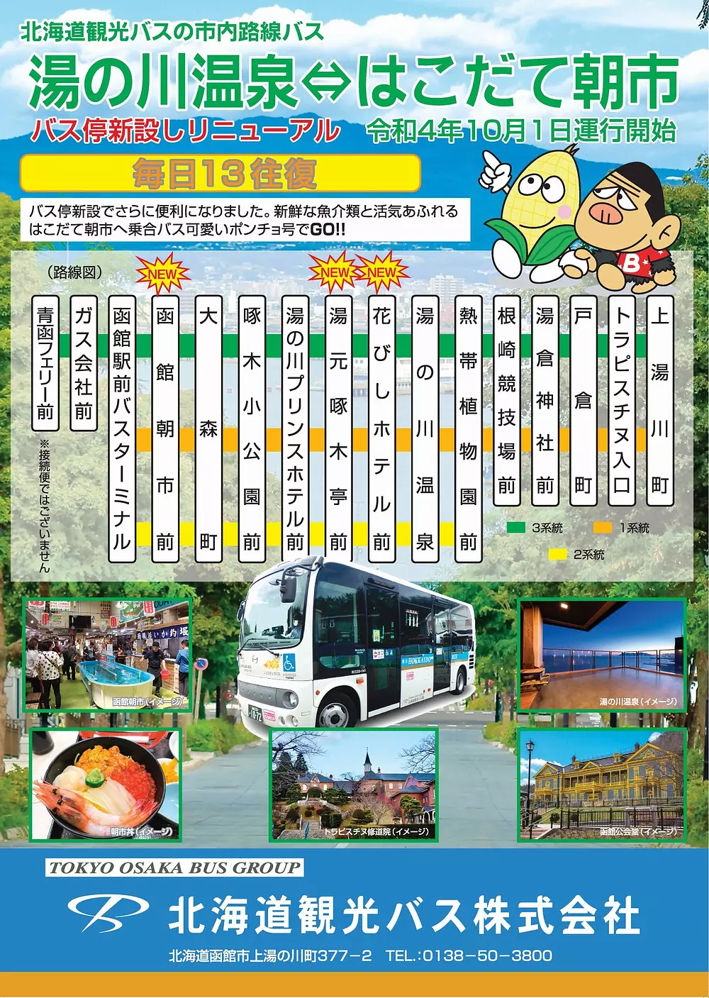北海道観光バスの函館市内路線バス。函館駅、函館朝市、啄木小公園、湯の川温泉の各ホテル、熱帯植物園、湯倉神社、トラピスチヌ修道院(正門まで徒歩10分程度)など、人気の観光スポットを、愛らしいポンチョ号で巡る乗合バスです。