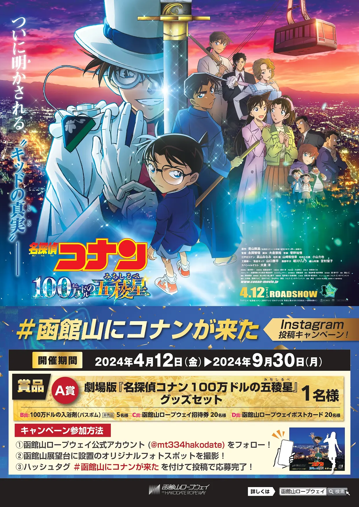 函館山ロープウェイは、2024年4月12日(金)公開の劇場版『名探偵コナン 100万ドルの五稜星(みちしるべ)』の公開を記念し、9月30日(月)までコラボ企画を実施します。