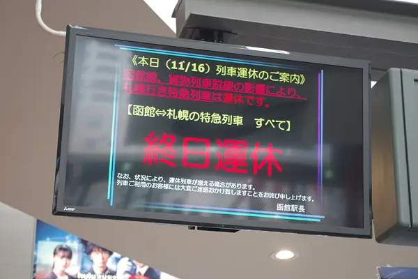 本日(11/16)午前1時40分ごろ発生した函館本線の森~石倉駅間でのJR貨物の貨物列車脱線の影響で、札幌~函館間の特急北斗は、函館発が終日運休または函館~洞爺間で部分運休、函館発の普通列車は森~長万部間が運休または部分運休となっています。