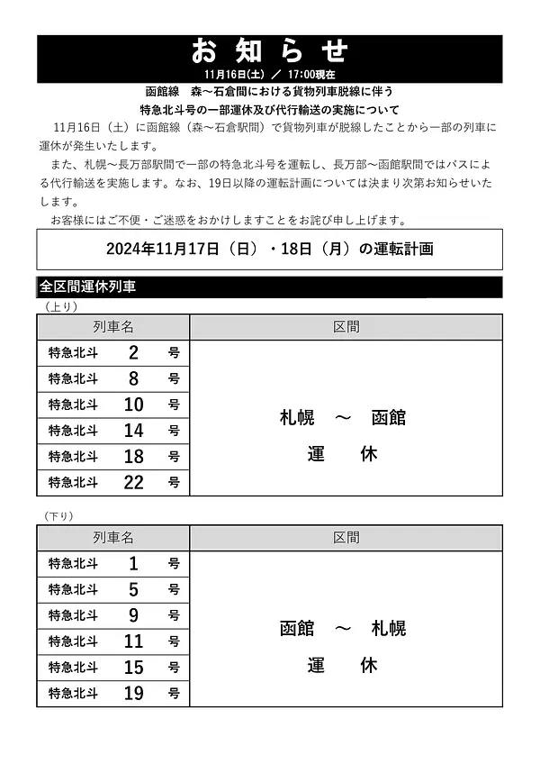 【緊急のお知らせ】11月17・18日の特急北斗の運行に関して