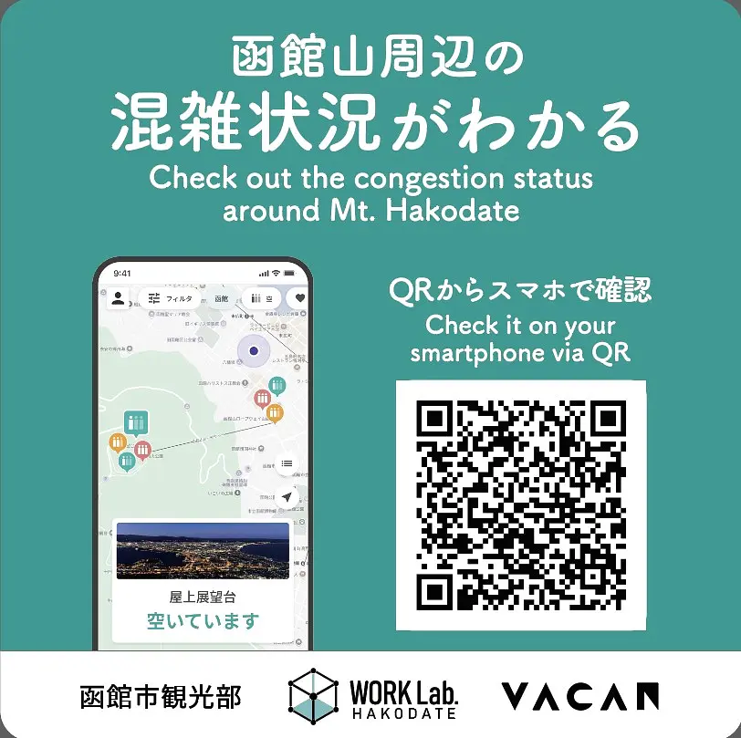 スマートフォン・タブレット端末・パソコンで専用サイトにアクセスすると、地図上に函館山周辺の8か所のスポットの混雑状況が「空いています」「やや混雑」「混雑」「大混雑」の4段階で表示されるほか、函館山ロープウェイの現在の待ち時間もわかります。