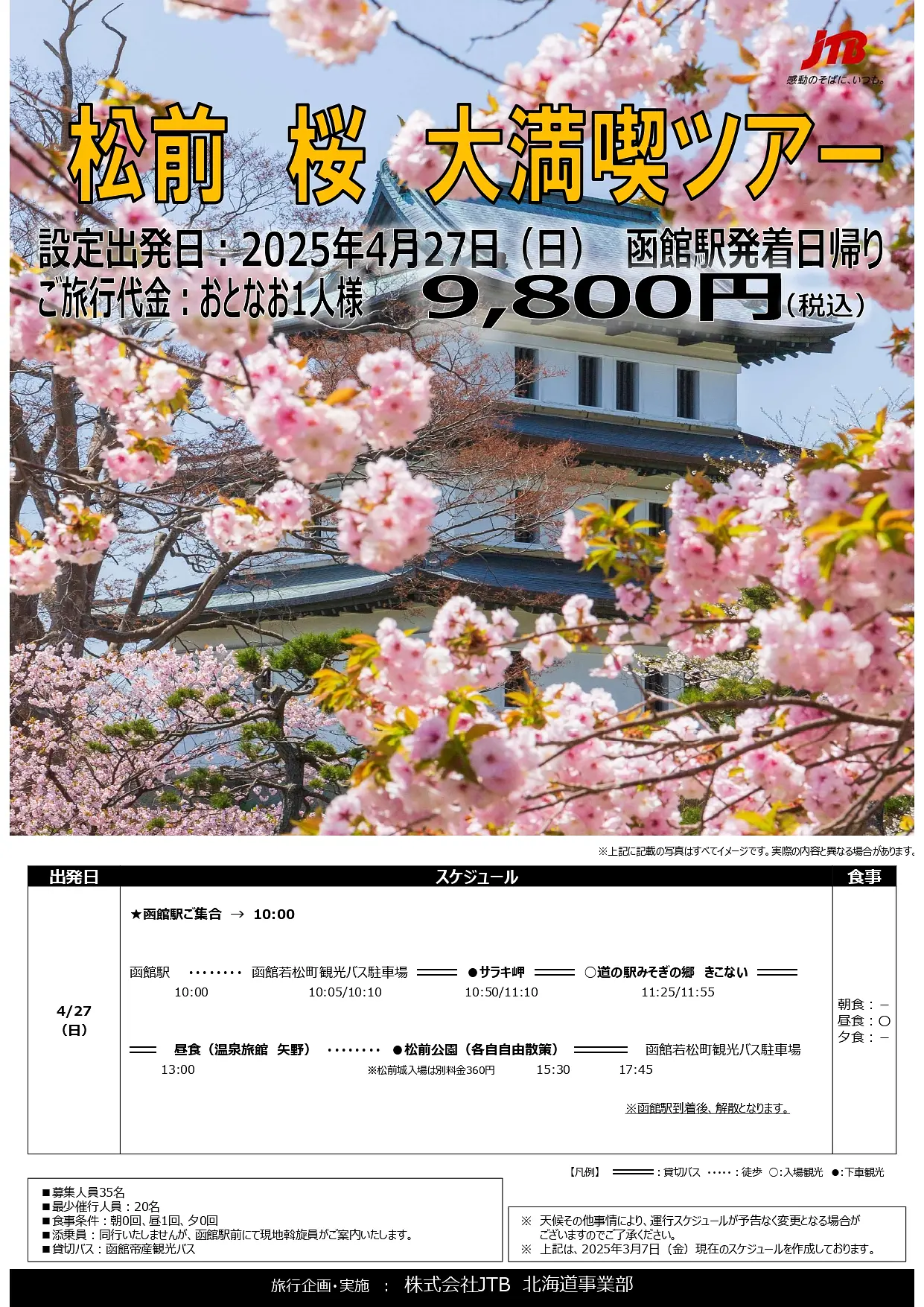 JTBでは、4月27日に実施する「松前桜大満喫ツアー」の参加者を募集しています。