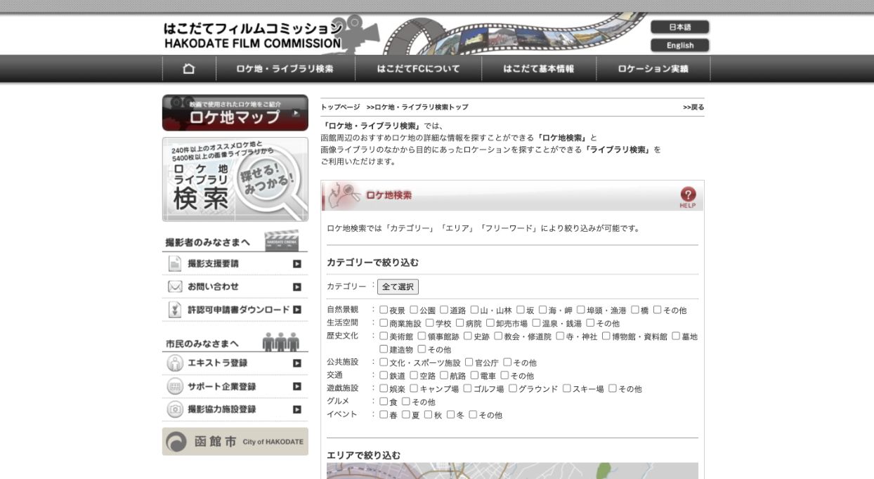 函館周辺のおすすめロケ地に関する情報を提供するサイト。画像はカテゴリー、エリア、フリーワードなどで選べます。