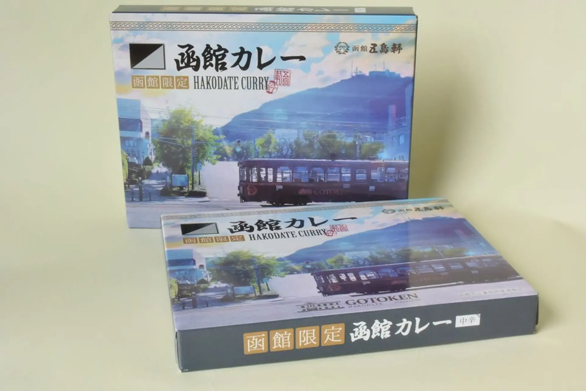 函館みやげの定番、五島軒の函館カレー(中辛)の味をそのままに、特別パッケージで本店限定販売。五島軒ラッピングの市電をメインにしたデザインで、電車ファンにも人気。