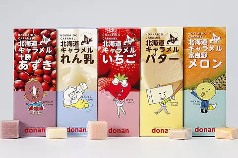 北海道の素材にこだわったキャラメルシリーズ。バラエティーに富んだ北海道の恵みをモチーフにしたユニークなキャラクターが特徴。気軽なおみやげ菓子「タビノアカシオカシ」に。