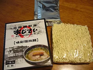 老舗ラーメン店・函館麺厨房あじさいの、おみやげ用オリジナル乾麺。スープは塩、正油、味噌の3種類。賞味期限が長く、お店の味を家庭でも気軽に味わえる。