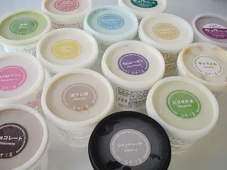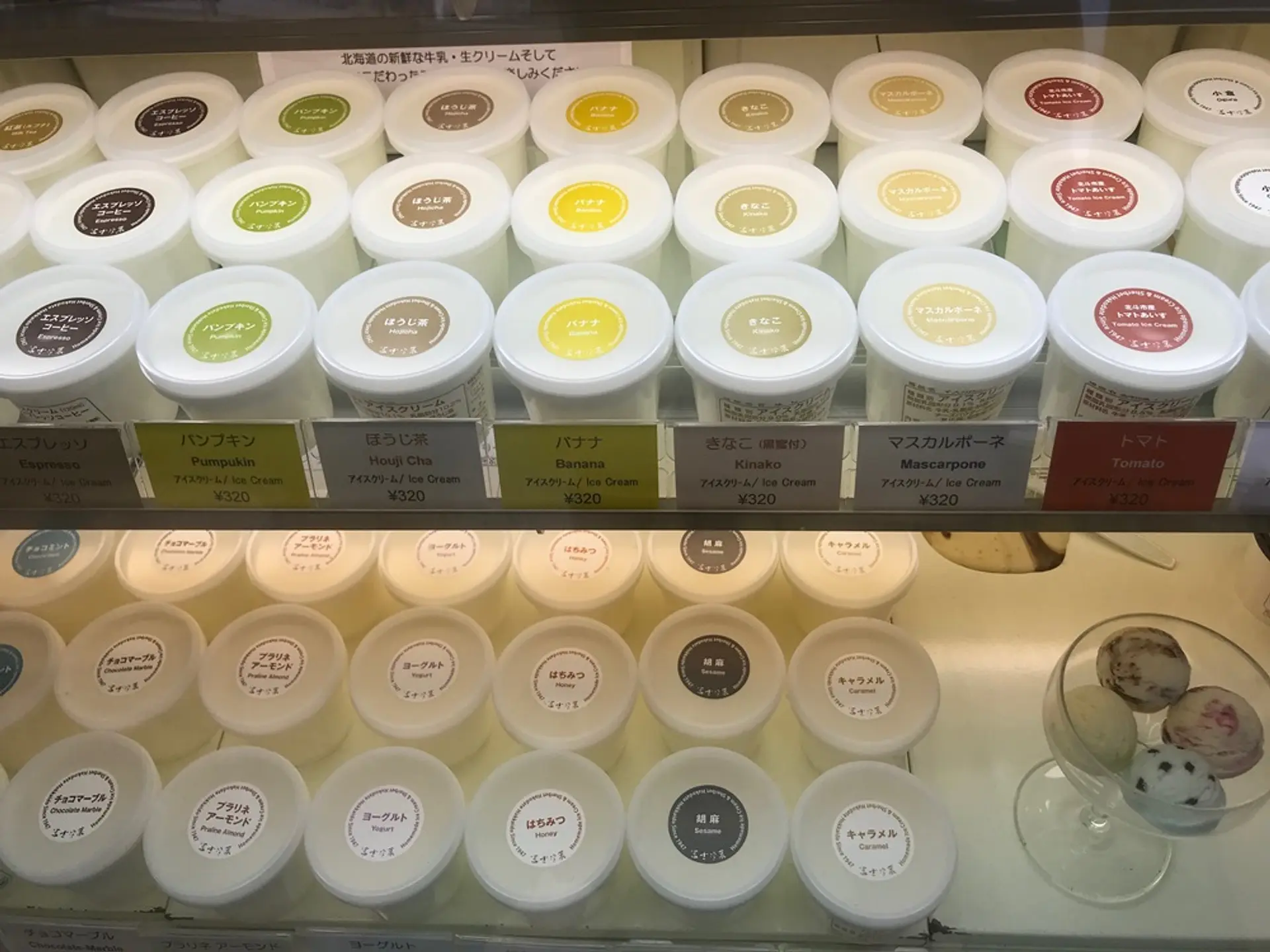 お店には常時40種類以上のアイスクリームやシャーベットが並び、冷凍ケースの中はまるで宝石箱のよう。店舗後ろにある工場での少量生産を基本としているそうで、作りたての味が楽しめます。原料は、北海道の新鮮な牛乳と生クリーム、そしてさまざまなフレーバーの天然素材。北海道産のきな粉、あずき、かぼちゃ、夕張メロン(夏季限定)をはじめ、紅茶、エスプレッソコーヒー、ほうじ茶、抹茶などの自然な香りを生かしたもの、ピーナッツバター、キャラメルなどなど、個性派ぞろいのラインナップです。