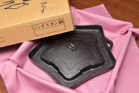 函館でただ一人の鋳物用木型職人が、熟練の技を駆使して作り上げたオリジナルのジンギスカン鍋。輻射熱の効果で肉の旨みを閉じ込めるため、肉がおいしく焼けると評判。