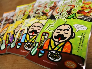 誕生ストーリーもユニーク。いか塩辛のふりかけかお茶漬けを作ろうと試作を重ねるなか、フリーズドライ加工をしたいかの塩辛の美味しさに気づいたそうです。美味しさの秘密は「美味しい塩辛で作ること」とシンプル。数十種類ある同社の塩辛のなかから試作で選びぬかれて、「塩辛、干しちゃった」として誕生しました。パッケージには、「失敗作ではありません」のユーモアあるメッセージ。日持ちもするので、海鮮珍味好きな方に話題性満点のおみやげはいかがですか。