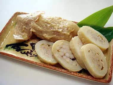 もっちりと茹で上げたイカに甘い酒粕をからめた一品。郵便局のふるさと小包全国大会で第1位を受賞するなど人気商品。夜景のパッケージもおみやげにぴったり。
