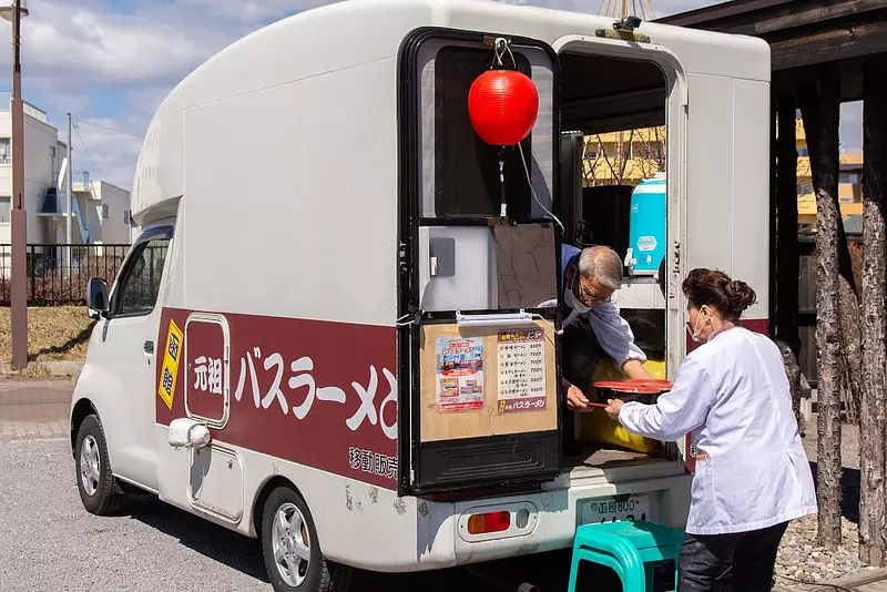 現在は、チャルメラを鳴らしながら住宅街を流して、常連さんなど地元市民のあいだを巡っています。チャルメラを聞きつけ、どんぶり片手に家の前でバスを待つお客さんもあるそう。土日の11時~19時には、湯の川温泉のホテル「笑 函館屋」の駐車場で営業しています。そのほか、イベントや道の駅などの商業施設に出向くこともあります。どこかで出会ったら、ぜひ伝説の「バスラーメン」を味わってください。