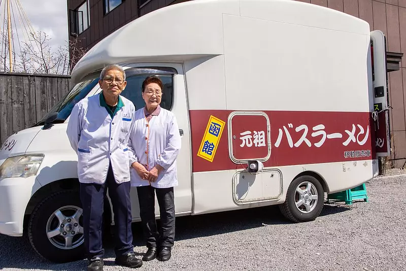 「函館元祖バスラーメン」は、長年小型バスを使って函館市内を回り、各種ラーメンを販売してきた店で、開店は1978年。「人と同じことをしていると商売は成り立たない」と考えたご主人が自ら車両を改良し、このスタイルを夫婦二人三脚で始めました。湯の川温泉街のほか、函館市内のイベントやクルーズ客船入港時などでラーメンを提供してきましたが、車体の老朽化のため、2021年11月からさらに小型のキッチンカーに乗り換え、テイクアウトのみの営業(テイクアウト用容器の対応、またはどんぶり持ち込み)となりました。