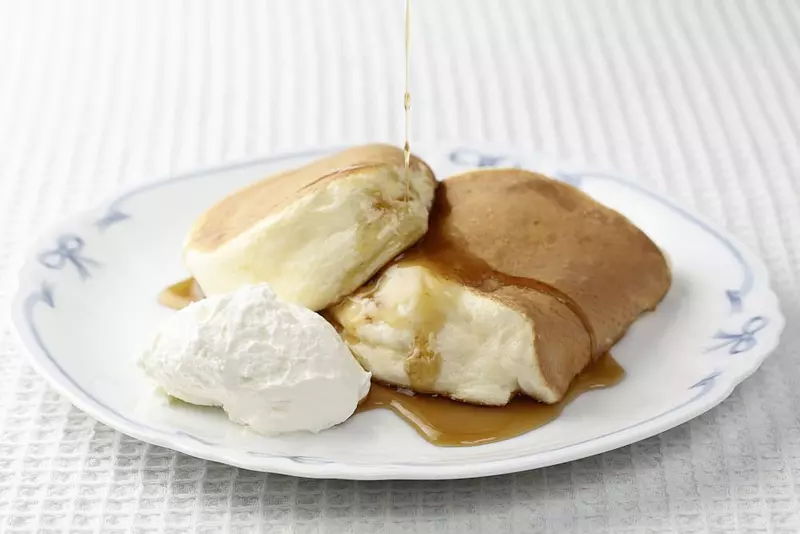 漁火通店と帯広本店だけの限定メニュー「帯広の森(900円)」は、リコッタチーズを使ったスフレタイプのパンケーキ。ふんわり柔らかな生地に、シロップと甘さ控えめの生クリームをたっぷりかけてどうぞ。口の中でとろけていくような食感が楽しめます。そのほか、季節ごとに入れ替わる新メニューもあり。