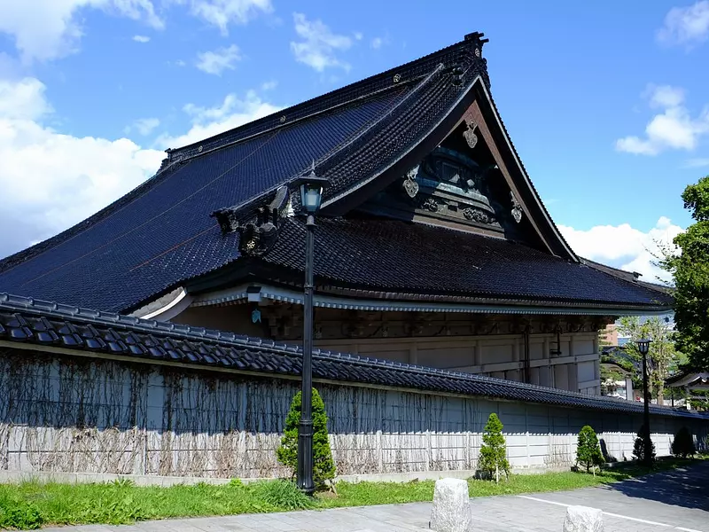 函館山山麓の坂道で最も広い幅員の二十間坂沿い。日射しを受けて黒光りする瓦屋根の建物が威風堂々とそびえています。 1915(大正4)年の建て替え時に、鉄筋コンクリート造りとなり、現存する鉄筋コンクリート造りの寺院としては日本最古。明治から昭和初期にかけて、函館は度重なる大火に見舞われた町。大火に強い建築物を求められるのは必然のことだったのでしょう。しかし、信仰に関わる場所ゆえに、人の踏んだ土砂やアメリカ製の鉄筋を使用することに異論を唱える信徒も多く、思うように寄付金が集まりませんでした。そのため、使用する骨材を水洗いしたほか、高床に芸者を上げて手踊りを披露するなど、新工法に対する信用を得ようとしたのだそうです。
