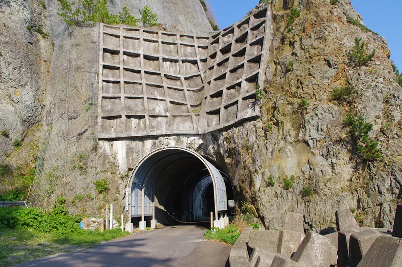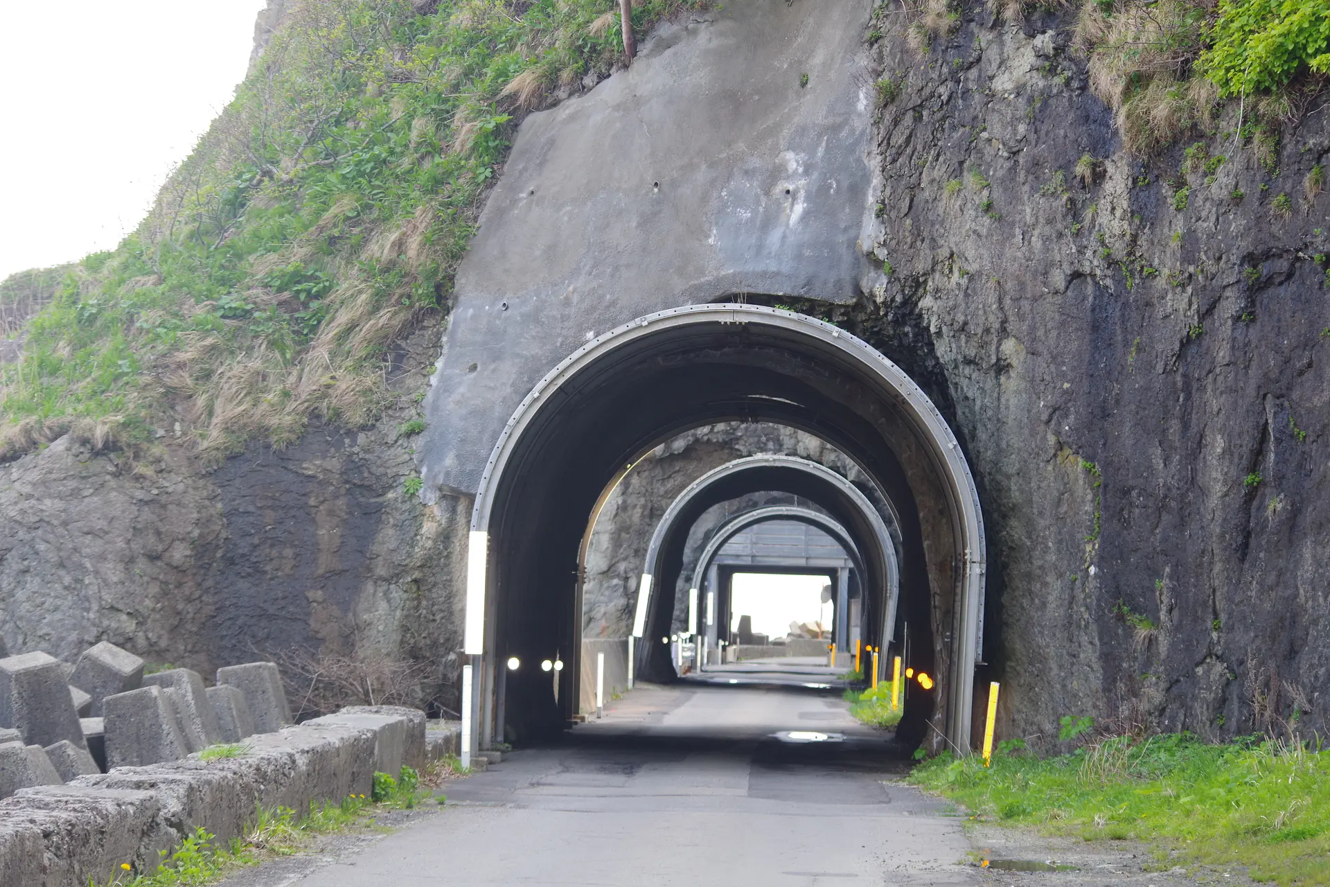 函館中心部から恵山に向かう途中、日浦海岸にせり出した岩盤を素掘りした7つのトンネルは、日浦洞門と呼ばれます。1929(昭和4)年に開通。絶壁の海岸に道を通すために、硬い岩盤を素掘りで砕いてトンネルが掘られた歴史がしのばれます。