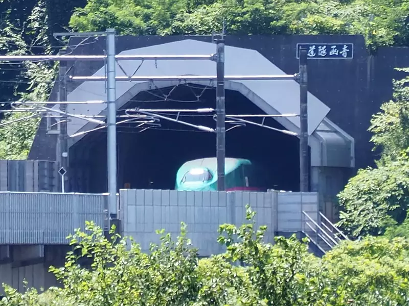 ここは、全長53.85キロメートルの青函トンネルの、北海道側の出入口が見られる撮影ポイント。青函トンネルを通って北海道と本州を行き来する新幹線の「はやぶさ」H5系・E5系や貨物列車が疾走する様子を眺めることができます。トンネルの中から「ゴオーッ」という音が聞こえ出し、ほどなく真っ暗なトンネル内から、新幹線の先頭車や貨物列車の機関車が勢いよく飛び出してくる様子は、何度も見たくなる光景です。