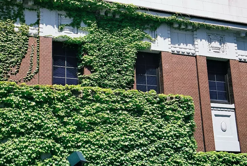 この建物をご覧になる時、ちょっと気にしていただきたいのが、建物に向かって左側奥にある職員通用口附近です。湾曲したアプローチ部分や玄関にかかる屋根の支えなど、こんなところにまでこだわっているのかと、驚くばかり。本物は手を抜くところを知らないのですね。そして、もうひとつは夕陽が差し込んだときの輝き。茶色の外壁に赤い光が当たると、金色に輝いて見えるのです。それは「美」以外の何ものでもありません。