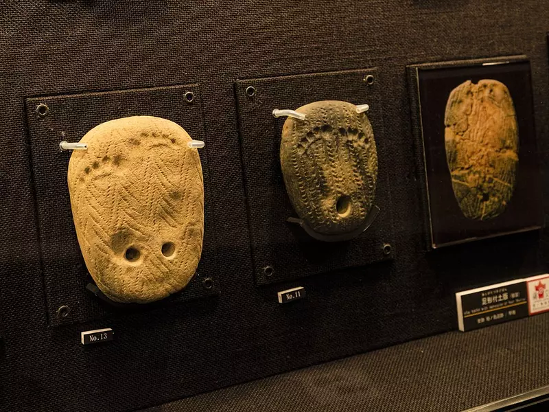 幼児や子どもの足形や手形を写し取った足形付土版は、縄文時代早期末から前期初頭にかけて作られたとみられる特異な遺物。この足形や手形は亡くなった子どものもので、住居内に吊るして死者をしのび、親が亡くなると一緒に埋葬されたと考えられています。